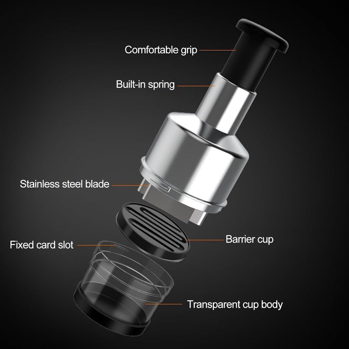 Answer 1: The push-down mechanism allows for swift, reliable chopping without the hassle of strings. Simply press down on the top to activate the blades, ensuring smooth operation without jams or breakage commonly associated with string-pull designs.