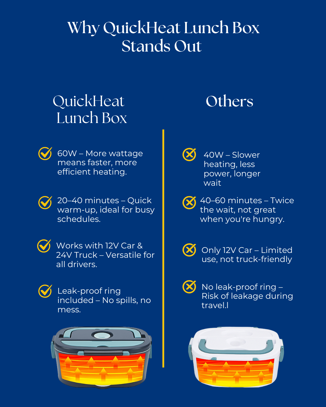 Answer 1: With its 80W rapid heating system, the portable lunch box heats your meals in just a few minutes, making it perfect for busy lifestyles and on-the-go eating.